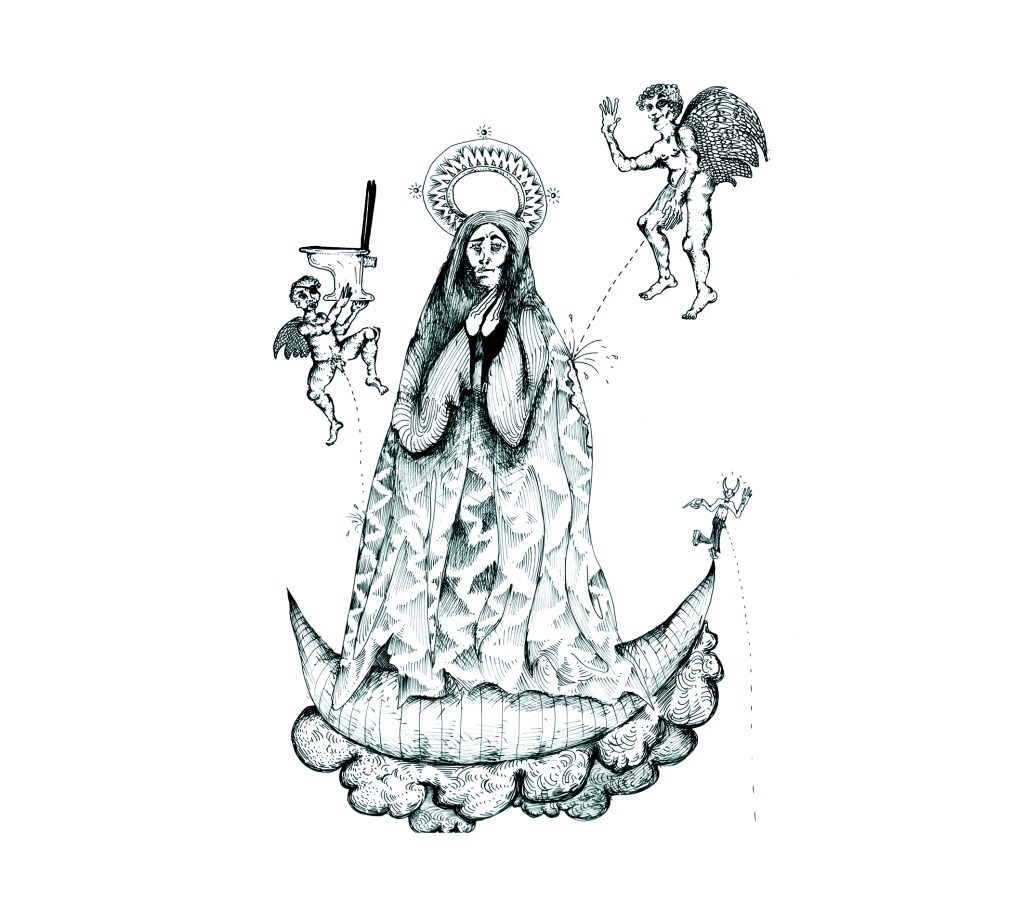 “Obvio, estoy bocetando unos cuadros de guerras religiosas. En uno de ellos, por ejemplo, hay una escena de un ejército de rabinos luchando con una sartén en mano contra calamares gigantes. Las religiones me atraen, leer sobre ellas, investigar. Creo en la fe sin nombre. Lo que no soporto son las instituciones religiosas y sus mentiras, sus romances con los crímenes, cómo ocultan la verdad y las reglas culposas para manejar la fe de la gente me da asco” sostiene.