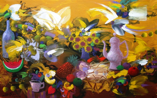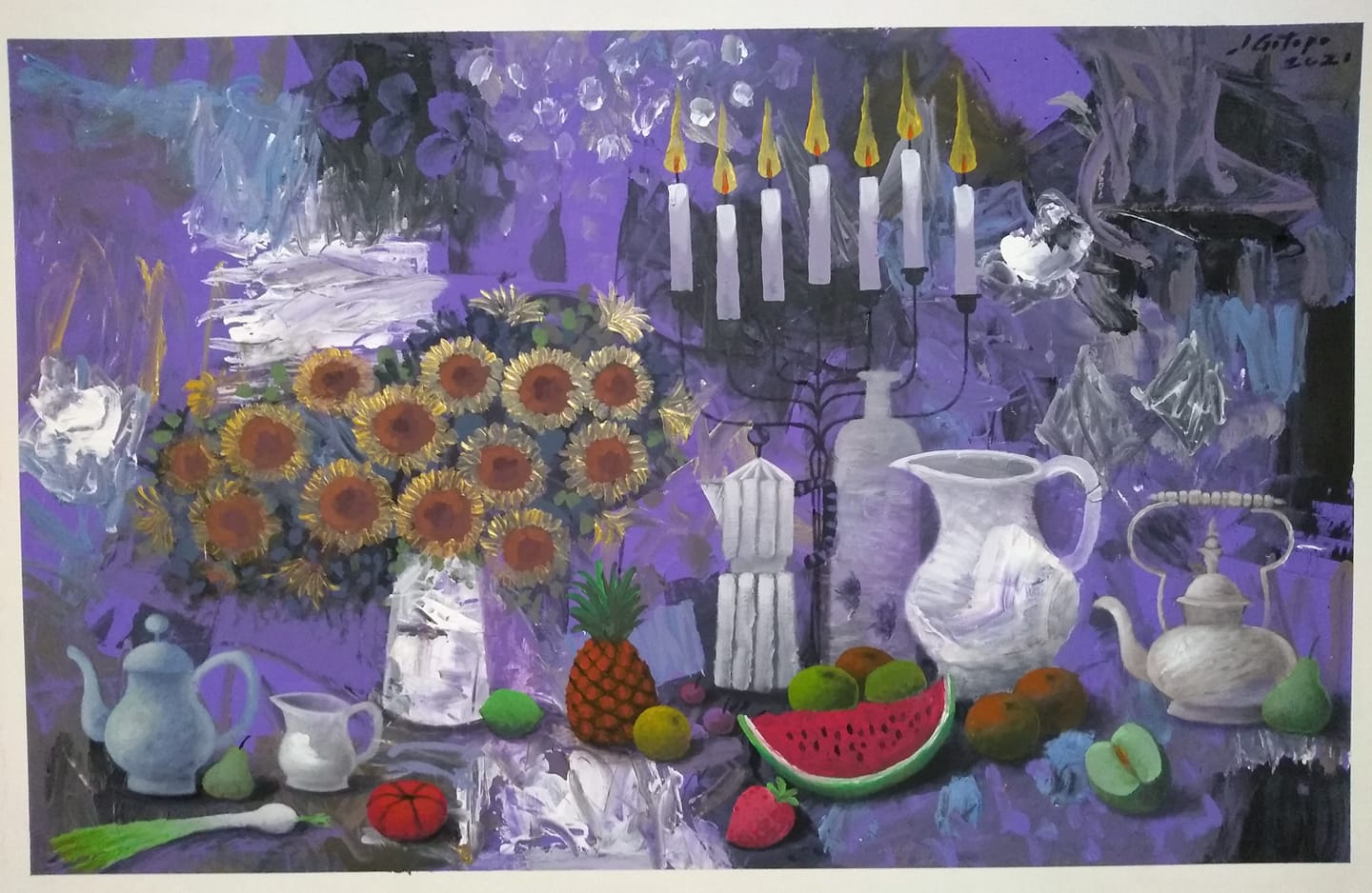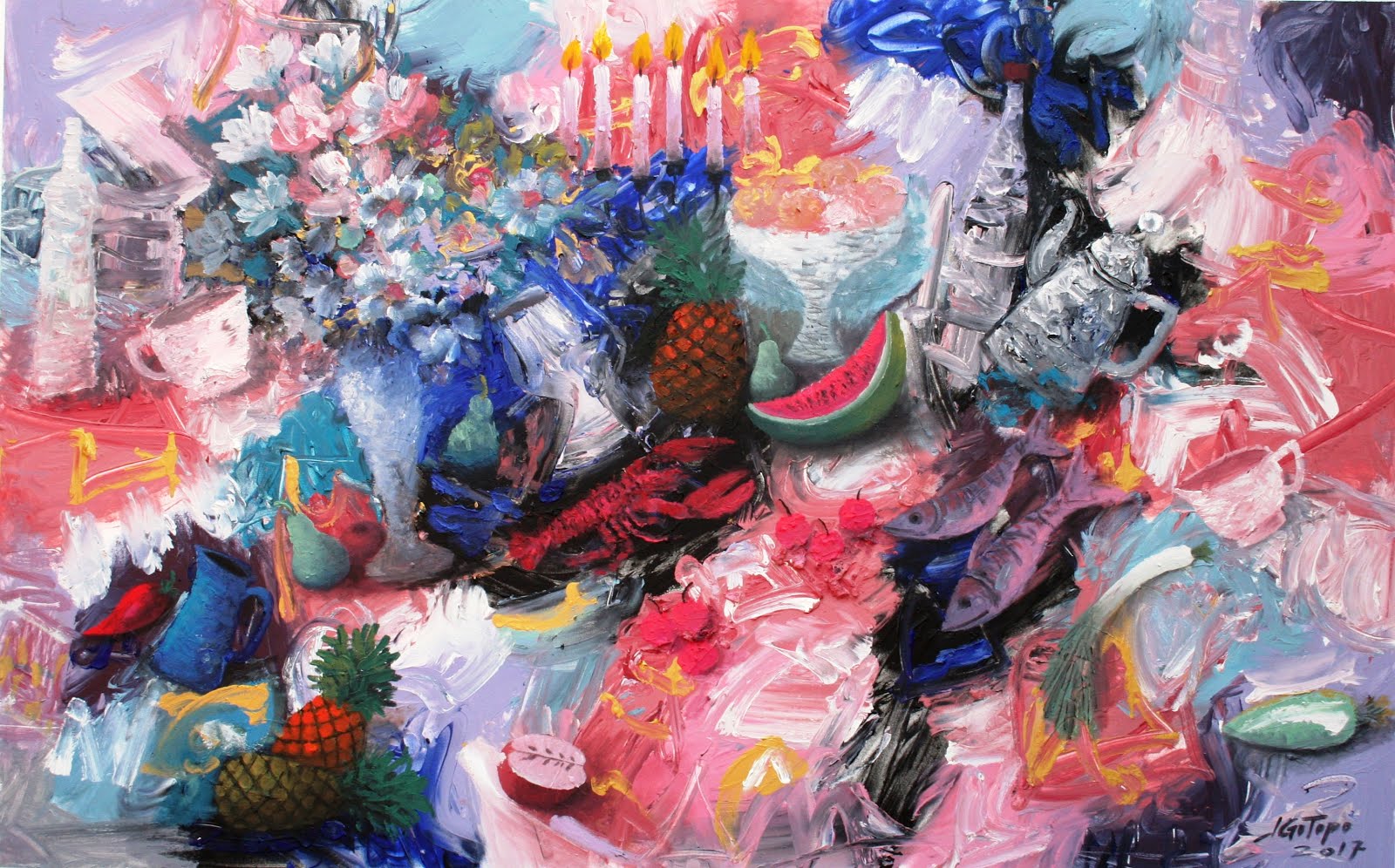 De Gotopo supe después, de su enfermedad, de su tratamiento, de su ida del país, ese país que soñamos alguna vez entre cervezas bajo un sol de 40 grados, y que ahora nos pesa tanto. Un día antes de partir, compartió en sus redes sociales la pintura «Día de fiesta» (Acrílico sobre lienzo, 90×112 cm, México 2021) Habrá fiesta con comilonas y alegría a donde quieras que vayas.
